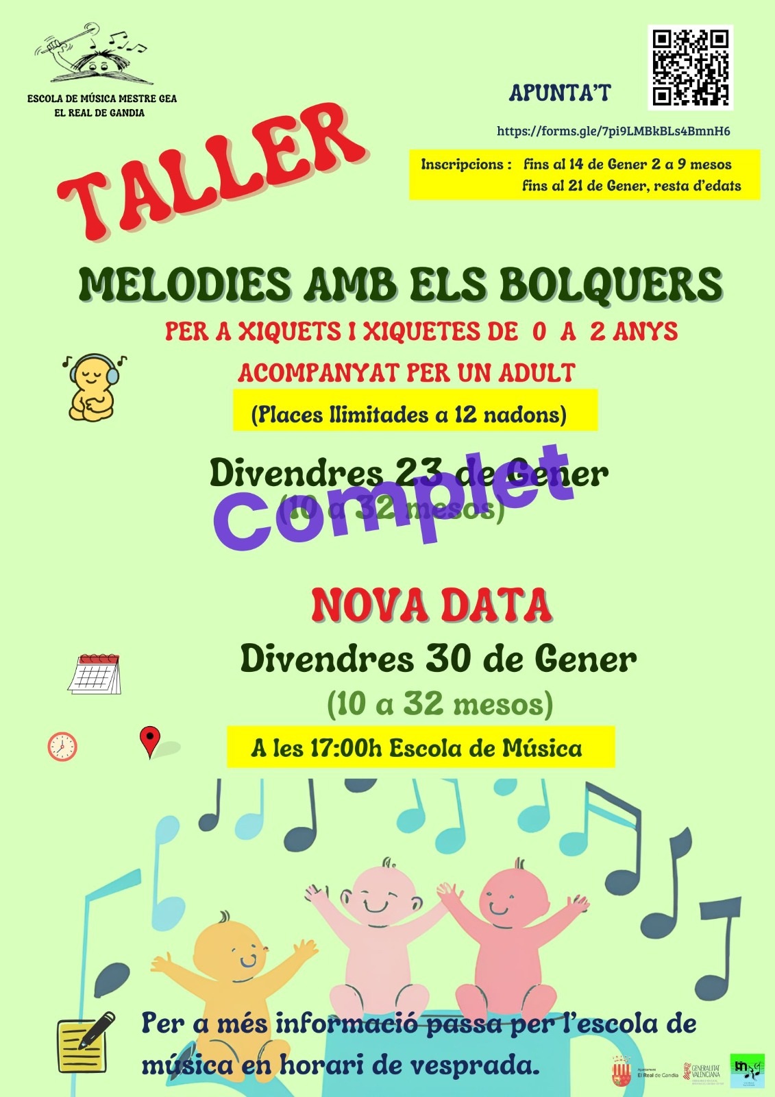 Que degut a la gran acollida que ha tingut el taller "Melodies amb els bolquers" NO queden places per al taller del dia 23 corresponent als xiquets i ...